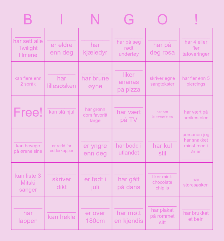 This bingo card has 36 words: ________ har gått på dans, ________ er født i juli, ________ har møtt en kjendis, ___________ kan flere enn 2 språk, ___________ kan bevege på ørene sine, ________ har vært på TV, ________ har lillesøsken, ________ er over 180cm, ________ har på deg rosa, ___________ liker mint-chocolate chip is, ___________ har fler enn 5 piercings, __________ har på seg rødt undertøy, ___________ har storesøsken, __________ kan slå hjul, ________ liker ananas på pizza, ________ har sett alle Twilight filmene, _________ kan liste 3 Mitski sanger, _______________ har hatt tannregulering, Free!, ________ har kjæledyr, ___________ har grønn dom favoritt farge, ____________ er redd for edderkopper, _________ har bodd i utlandet, ________ er yngre enn deg, ________ har kul stil, ________ er eldre enn deg, ___________ skriver egne sangtekster, ________ kan hekle, ________ har brune øyne, __________ har 4 eller fler tatoveringer, __________ har brukket et bein, ________ har lappen, personen jeg har snakket minst med i år er ___________, ___________ har vært på preikestolen, ________ skriver dikt and __________ har plakat på rommet sitt.