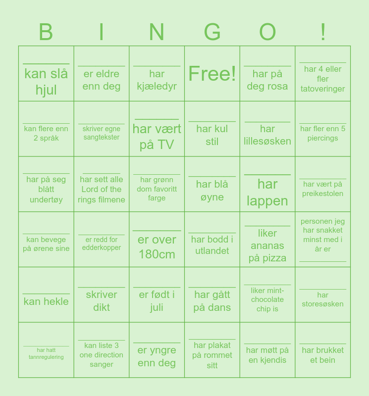 This bingo card has 36 words: ________ har gått på dans, ________ er født i juli, __________ har plakat på rommet sitt, ___________ kan flere enn 2 språk, ___________ kan bevege på ørene sine, ________ har blå øyne, ____________ skriver egne sangtekster, ________ er yngre enn deg, ________ har på deg rosa, ___________ liker mint-chocolate chip is, ___________ har fler enn 5 piercings, Free!, ___________ har storesøsken, ________ har sett alle Lord of the rings filmene, ________ har kul stil, ______ kan slå hjul, ________ kan hekle, ______ har lappen, __________ har på seg blått undertøy, ________ har kjæledyr, ___________ har grønn dom favoritt farge, ____________ er redd for edderkopper, _________ har bodd i utlandet, _______ er over 180cm, ________ liker ananas på pizza, ________ er eldre enn deg, ________ har lillesøsken, ___________ kan liste 3 one direction sanger, ______ har vært på TV, __________ har 4 eller fler tatoveringer, __________ har brukket et bein, _______________ har hatt tannregulering, personen jeg har snakket minst med i år er ___________, ___________ har vært på preikestolen, ________ skriver dikt and __________ har møtt på en kjendis.