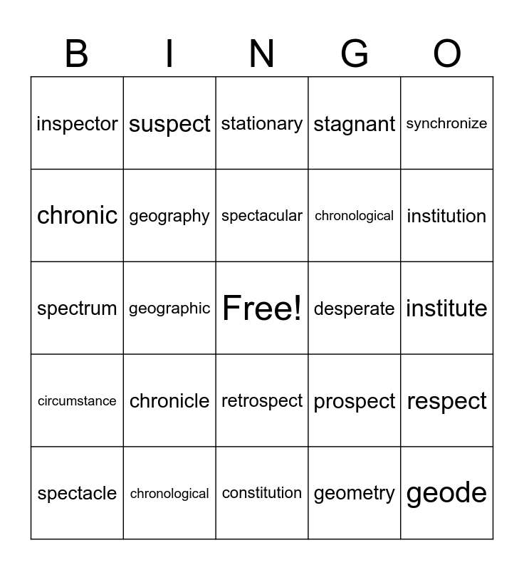 This bingo card has a free space and 24 words: chronicle, chronological, spectacular, spectacle, synchronize, inspector, chronic, suspect, desperate, retrospect, chronological, spectrum, prospect, respect, geography, geometry, institute, stationary, institution, geographic, geode, circumstance, stagnant and constitution.