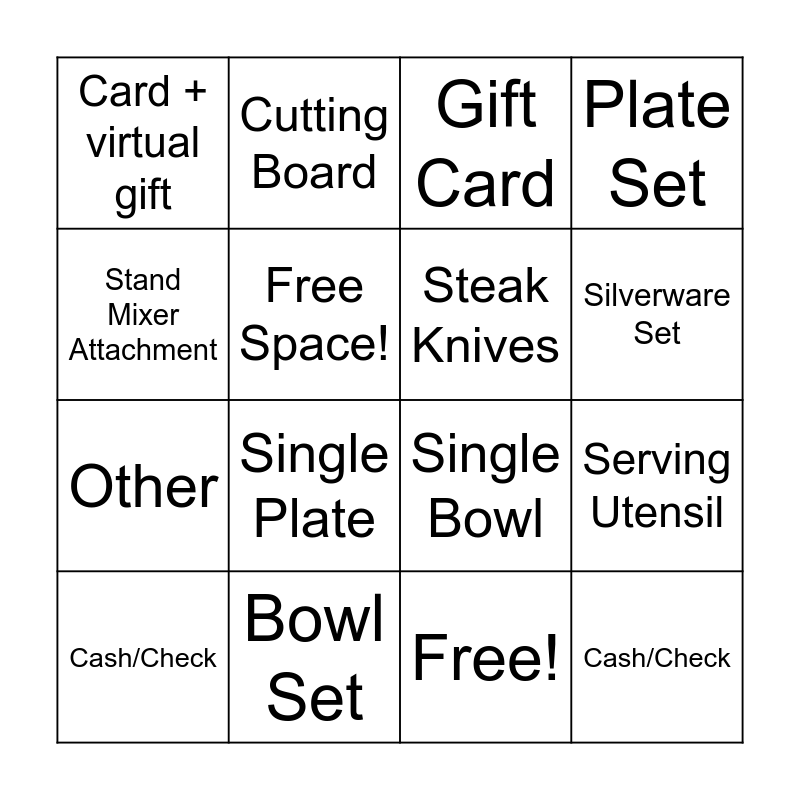 This bingo card has 17 words: Free!, Cash/Check, Gift Card, Card + virtual gift, Single Plate, Plate Set, Serving Utensil, Steak Knives, Silverware Set, Free Space!, Bowl Set, Single Bowl, Stand Mixer Attachment, Cutting Board, Other, Other and Cash/Check.