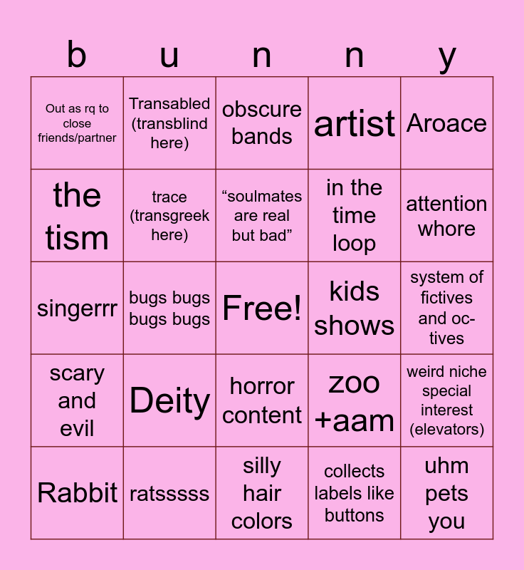 This bingo card has a free space and 24 words: Rabbit, Deity, “soulmates are real but bad”, collects labels like buttons, Aroace, Out as rq to close friends/partner, Transabled (transblind here), obscure bands, kids shows, system of fictives and oc-tives, singerrr, trace (transgreek here), zoo +aam, weird niche special interest (elevators), the tism, ratsssss, silly hair colors, artist, attention whore, scary and evil, bugs bugs bugs bugs, horror content, in the time loop and uhm pets you.