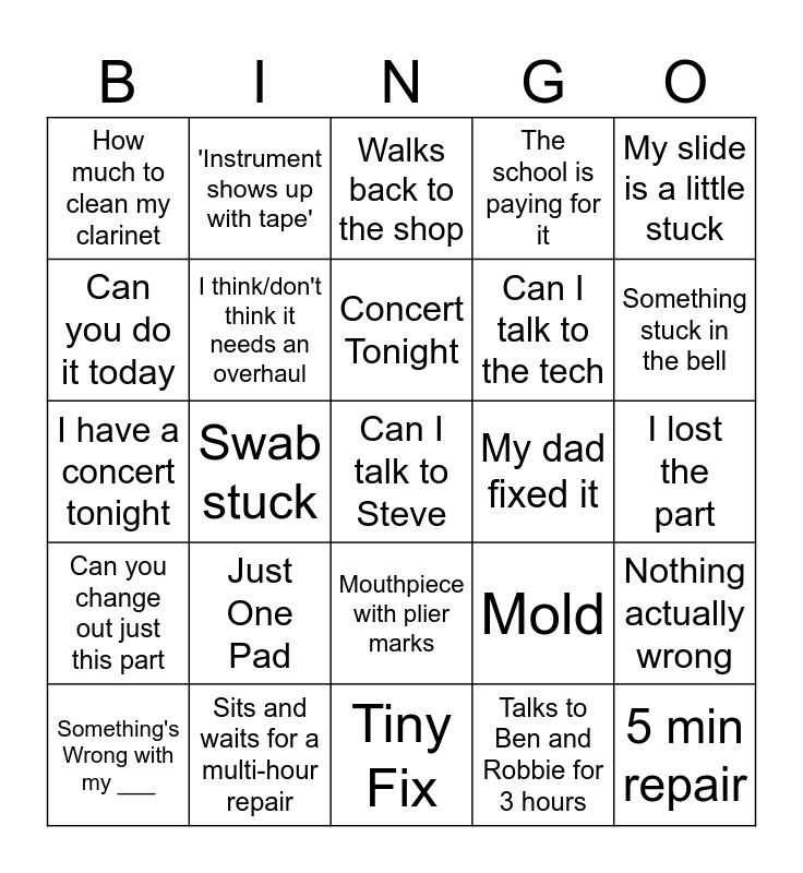 This bingo card has 25 words: Just One Pad, Tiny Fix, Concert Tonight, Something's Wrong with my ___, My slide is a little stuck, How much to clean my clarinet, Can you do it today, 'Instrument shows up with tape', My dad fixed it, Mouthpiece with plier marks, Can I talk to the tech, I have a concert tonight, Mold, Nothing actually wrong, I think/don't think it needs an overhaul, 5 min repair, I lost the part, Walks back to the shop, Something stuck in the bell, Swab stuck, Can I talk to Steve, Sits and waits for a multi-hour repair, Can you change out just this part, The school is paying for it and Talks to Ben and Robbie for 3 hours.