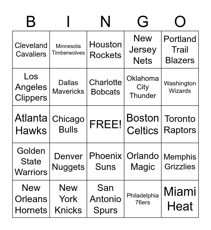 This bingo card has a free space and 30 words: New York Knicks, Los Angeles Lakers, Chicago Bulls, Detroit Pistons, Cleveland Cavaliers, Houston Rockets, Dallas Mavericks, Phoenix Suns, Boston Celtics, San Antonio Spurs, Toronto Raptors, Miami Heat, Philadelphia 76ers, Utah Jazz, Washington Wizards, Sacramento Kings, Orlando Magic, Golden State Warriors, Denver Nuggets, Portland Trail Blazers, Atlanta Hawks, Indiana Pacers, Minnesota Timberwolves, Oklahoma City Thunder, Los Angeles Clippers, New Jersey Nets, Memphis Grizzlies, New Orleans Hornets, Charlotte Bobcats and Milwaukee Bucks.