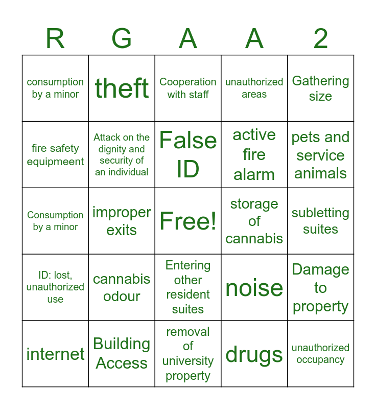 This bingo card has a free space and 40 words: Open Alcohol, Consumption by a minor, mass consumption, Attack on the dignity and security of an individual, Building Access, Entering other resident suites, False ID, Guests or Visitors, Gathering size, ID: lost, unauthorized use, improper exits, unauthorized areas, unauthorized occupancy, subletting suites, storage of cannabis, cannabis odour, smoking cannabis, consumption by a minor, garbage, Cooperation with staff, Damage to property, drugs, active fire alarm, fire safety equipmeent, smoke alarams, smoking indoors, appliances, explosive materials, open flame, weapons, inappropriate behaviour, internet, maintenance, noise, pets and service animals, removal of university property, scents, solictation/operating a business, theft and violence.