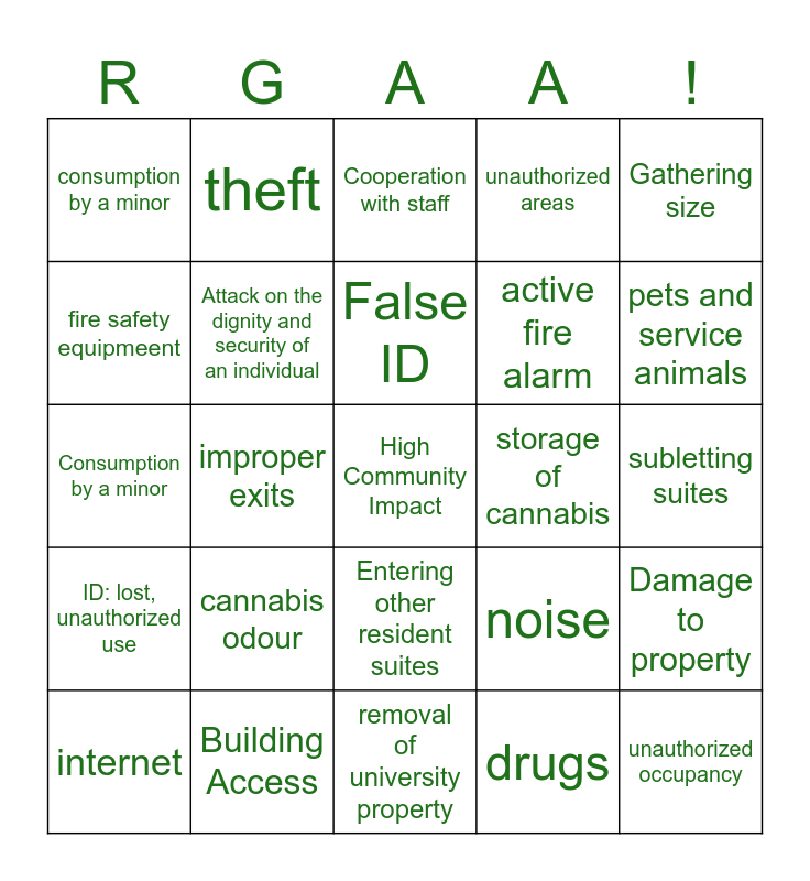 This bingo card has a free space and 40 words: Open Alcohol, Consumption by a minor, mass consumption, Attack on the dignity and security of an individual, Building Access, Entering other resident suites, False ID, Guests or Visitors, Gathering size, ID: lost, unauthorized use, improper exits, unauthorized areas, unauthorized occupancy, subletting suites, storage of cannabis, cannabis odour, smoking cannabis, consumption by a minor, garbage, Cooperation with staff, Damage to property, drugs, active fire alarm, fire safety equipmeent, smoke alarams, smoking indoors, appliances, explosive materials, open flame, weapons, inappropriate behaviour, internet, maintenance, noise, pets and service animals, removal of university property, scents, solictation/operating a business, theft and violence.