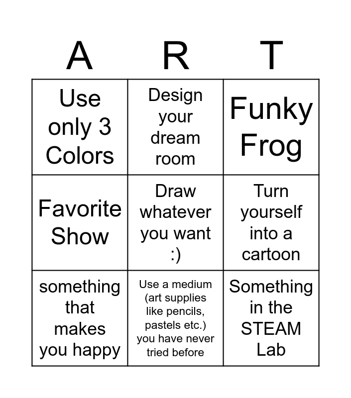 This bingo card has a free space and 50 words: Draw someone in the STEAM Lab, Favorite Food, Something under the sea, Design a Cartoon Character, Draw how you feel today (what colors would you use to create it?), Bestie Fan Art, Design your dream room, Draw a pattern, Turn yourself into a cartoon, something inspired by a famous painting, something that makes you happy, Favorite Show, Monochrome (only one color, different shades are allowed), Fictional Character, something that scares you, Only use 2 colors, Use a medium (art supplies like pencils, pastels etc.) you have never tried before, something from another world, design an album cover from your favorite band/singer, Something in the STEAM Lab, Something Ugly, Something Silly, Use only 3 Colors, Something Big, Something Tiny, Make a drawing based on a song, Favorite season, The coolest cat, Funky Frog, Something magical, draw a scribble on your paper, make a drawing out of it, Favorite Anime, New OC (Original Character), Landscape (somewhere outside), Dream Vacation, the worlds worst pizza, Bug city, Make a Maze, You and your friends as superheroes, an idea for a new video game, A very cool cake, Favorite Animal, Something you couldn't live without, Favorite snack/drink, Draw your name with doodles/art inside of each letter, Mushrooms, Something you have always wanted, Favorite Fruit, Draw a monster and Something you hate/have beef with.