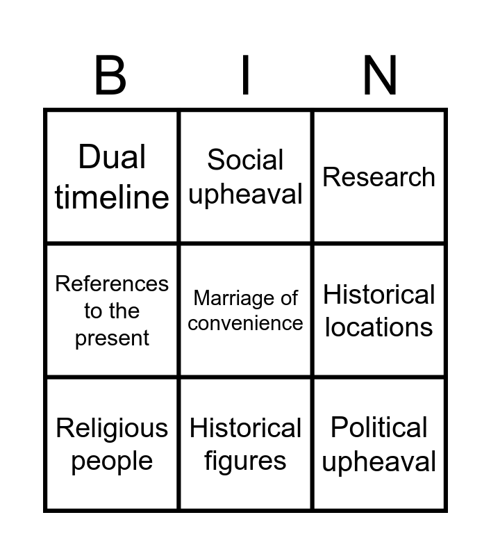 This bingo card has a free space and 8 words: Historical locations, Research, Social upheaval, Religious people, Dual timeline, Political upheaval, References to the present and Historical figures.