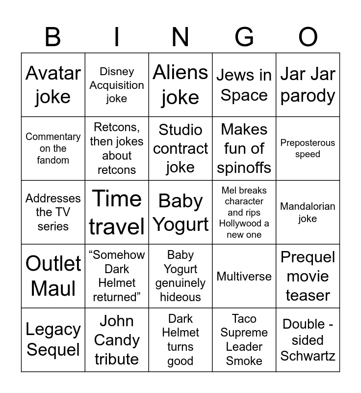 This bingo card has a free space and 24 words: “Somehow Dark Helmet returned”, John Candy tribute, Studio contract joke, Legacy Sequel, Jar Jar parody, Avatar joke, Commentary on the fandom, Disney Acquisition joke, Mel breaks character and rips Hollywood a new one, Baby Yogurt genuinely hideous, Makes fun of spinoffs, Addresses the TV series, Multiverse, Prequel movie teaser, Retcons, then jokes about retcons, Taco Supreme Leader Smoke, Mandalorian joke, Aliens joke, Preposterous speed, Time travel, Double -sided Schwartz, Outlet Maul, Jews in Space and Dark Helmet turns good.