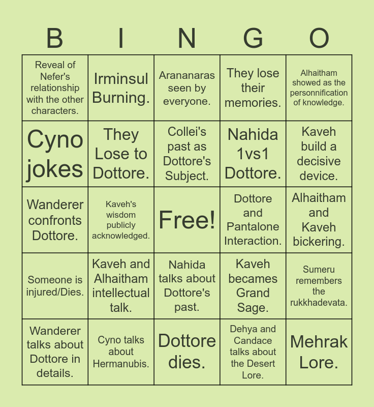 This bingo card has a free space and 24 words: Kaveh and Alhaitham intellectual talk., Cyno talks about Hermanubis., Collei's past as Dottore's Subject., Wanderer talks about Dottore in details., Alhaitham showed as the personnification of knowledge., Reveal of Nefer's relationship with the other characters., Cyno jokes, Irminsul Burning., Dottore and Pantalone Interaction., Nahida talks about Dottore's past., Nahida 1vs1 Dottore., Wanderer confronts Dottore., Kaveh becames Grand Sage., Sumeru remembers the rukkhadevata., They Lose to Dottore., Dehya and Candace talks about the Desert Lore., Alhaitham and Kaveh bickering., Arananaras seen by everyone., Kaveh build a decisive device., Kaveh's wisdom publicly acknowledged., Mehrak Lore., Someone is injured/Dies., They lose their memories. and Dottore dies..