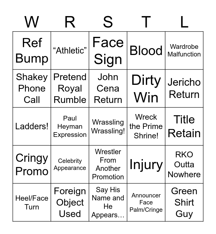 This bingo card has a free space and 45 words: Surprise Return, Green Shirt Guy, Betrayal, Heel/Face Turn, Botchamania!, Announcer Face Palm/Cringe, Face Sign, Funny Sign, Wardrobe Malfunction, Foreign Object Used, Blood, Wreck the Prime Shrine!, Wrestler From Another Promotion, Celebrity Appearance, Steel Aluminum Steps, Say His Name and He Appears…, Tables!, Ladders!, Awkwardly Standing Around, Jericho Return, “Athletic”, Interference!, Announce Table Breaks, Ref Bump, Title Change, Title Retain, Botched Finish, “Injury”, Injury, Cringy Promo, Cringy Ad/Commercial, RKO Outta Nowhere, Seth Fancy Jacket, Face Turn, Heel Turn, Paul Heyman Expression, Twerking, Unstoppable Finish Kick Out, Fall From Ladder, John Cena Return, Shakey Phone Call, Dirty Win, Illegal Move!, Pretend Royal Rumble and Character Break.