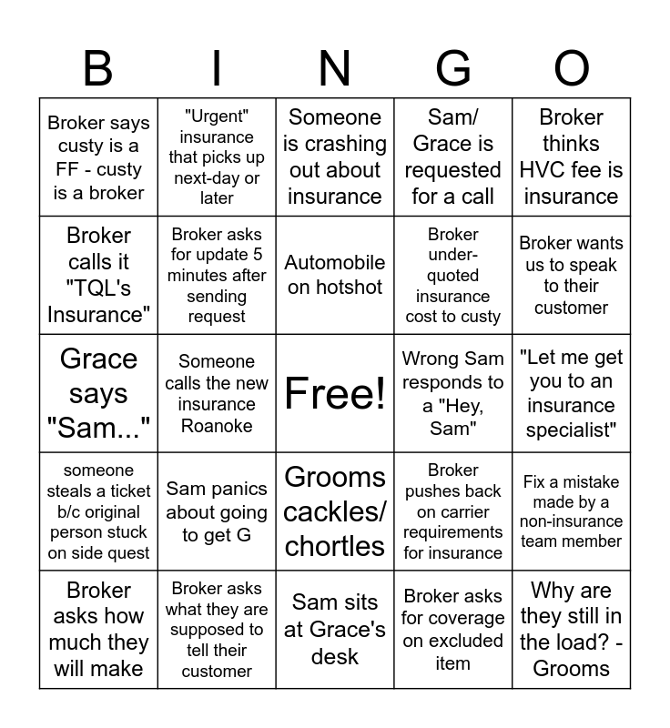 This bingo card has a free space and 45 words: Insurance is Never an Afterthought, Why are they still in the load? - Grooms, "Spike insurance", Broker asks how much they will make, Sam's deep sigh, Broker asks for coverage on excluded item, Someone is crashing out about insurance, Broker is mad the rates are higher, Broker thinks HVC fee is insurance, Broker asks what they are supposed to tell their customer, Sam/ Grace is requested for a call, Wrong Sam responds to a "Hey, Sam", Grooms cackles/ chortles, Sam panics about going to get G, Grooms puts Ben Affleck in the chat, Sam sits at Grace's desk, Grooms over-explains something, Grace says "Sam...", Broker requests insurance with carrier already on load or almost to shipper, Broker wants us to speak to their customer, "Urgent" insurance that picks up next-day or later, Broker replies on old purchase request with a new purchase request, Amber tries to buy insurance, Broker says custy is a FF - custy is a broker, Someone reminds Sam to go get G, "Let me get you to an insurance specialist", Grooms tells someone "Just assign me the ticket", Special quote that goes today, Broker pushes back on carrier requirements for insurance, someone steals a ticket b/c original person stuck on side quest, someone crashes out about pop culture reference, Fix a mistake made by a non-insurance team member, Grooms says "cool cool cool", Multiple requests on one email, Broker requests multiple load value changes, Someone calls the new insurance Roanoke, Someone finds a bug on Redkik, Redkik crashes, Someone requests insurance on an approval ticket, Automobile on hotshot, Broker calls it "TQL's Insurance", Broker under-quoted insurance cost to custy, Broker asks to increase the carrier's insurance, Broker asks for update 5 minutes after sending request and Grooms uses weird metaphor.