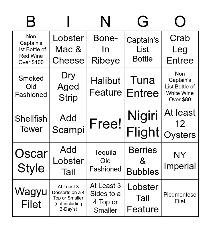 This bingo card has a free space and 24 words: Add Lobster Tail, At Least 3 Desserts on a 4 Top or Smaller (not including B-Day's), Halibut Feature, Wagyu Filet, Crab Leg Entree, Non Captain's List Bottle of Red Wine Over $100, Smoked Old Fashioned, Lobster Mac & Cheese, Nigiri Flight, Tequila Old Fashioned, Tuna Entree, Shellfish Tower, Berries & Bubbles, NY Imperial, Dry Aged Strip, Lobster Tail Feature, At least 12 Oysters, Bone-In Ribeye, Non Captain's List Bottle of White Wine Over $80, Add Scampi, Piedmontese Filet, Oscar Style, Captain's List Bottle and At Least 3 Sides to a 4 Top or Smaller.