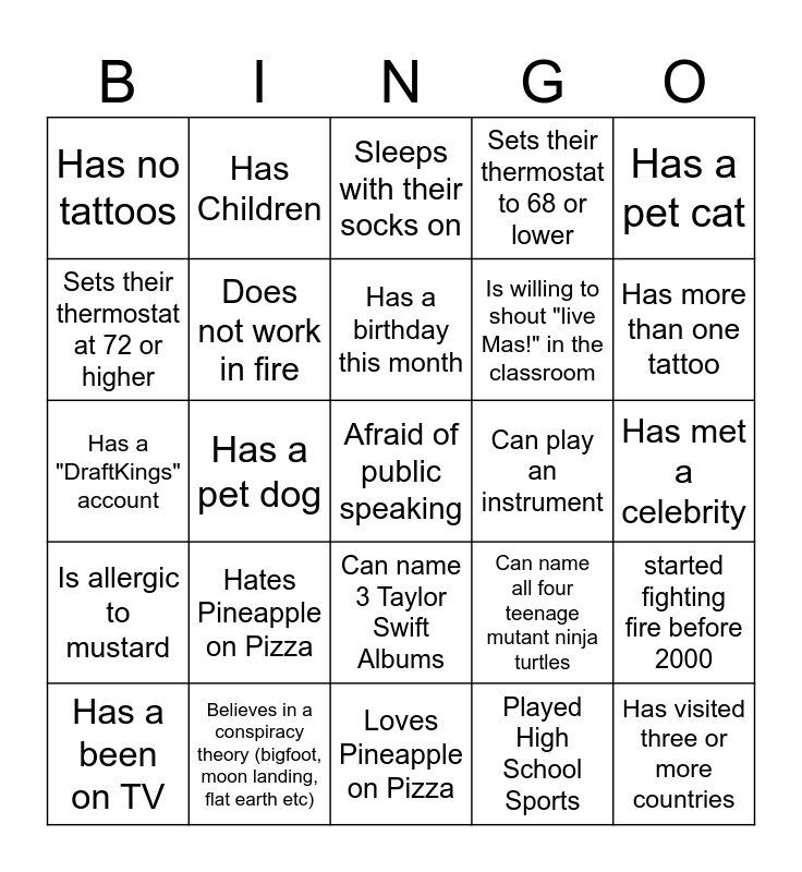 This bingo card has a free space and 24 words: Hates Pineapple on Pizza, Believes in a conspiracy theory (bigfoot, moon landing, flat earth etc), Has a birthday this month, Has a been on TV, Has a pet cat, Has no tattoos, Sets their thermostat at 72 or higher, Has Children, Can play an instrument, Can name 3 Taylor Swift Albums, Is willing to shout "live Mas!" in the classroom, Has a "DraftKings" account, Can name all four teenage mutant ninja turtles, started fighting fire before 2000, Does not work in fire, Played High School Sports, Has met a celebrity, Sleeps with their socks on, Has more than one tattoo, Has a pet dog, Has visited three or more countries, Is allergic to mustard, Sets their thermostat to 68 or lower and Loves Pineapple on Pizza.
