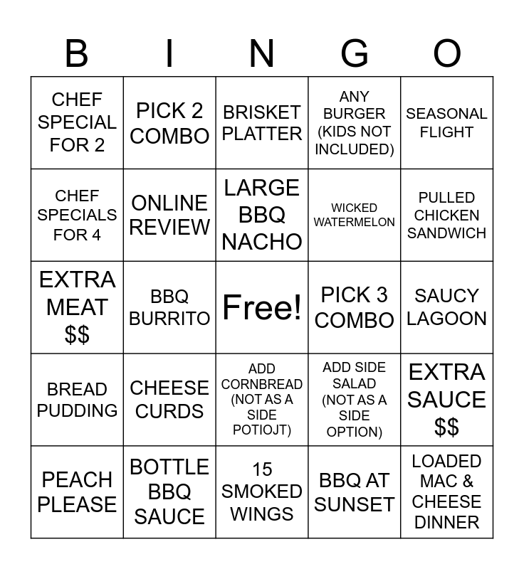 This bingo card has a free space and 24 words: CHEESE CURDS, BOTTLE BBQ SAUCE, LARGE BBQ NACHO, PEACH PLEASE, SEASONAL FLIGHT, CHEF SPECIAL FOR 2, CHEF SPECIALS FOR 4, PICK 2 COMBO, PICK 3 COMBO, ADD CORNBREAD (NOT AS A SIDE POTIOJT), WICKED WATERMELON, EXTRA MEAT $$, ADD SIDE SALAD (NOT AS A SIDE OPTION), EXTRA SAUCE $$, ONLINE REVIEW, BBQ AT SUNSET, SAUCY LAGOON, BRISKET PLATTER, PULLED CHICKEN SANDWICH, BBQ BURRITO, LOADED MAC & CHEESE DINNER, BREAD PUDDING, ANY BURGER (KIDS NOT INCLUDED) and 15 SMOKED WINGS.