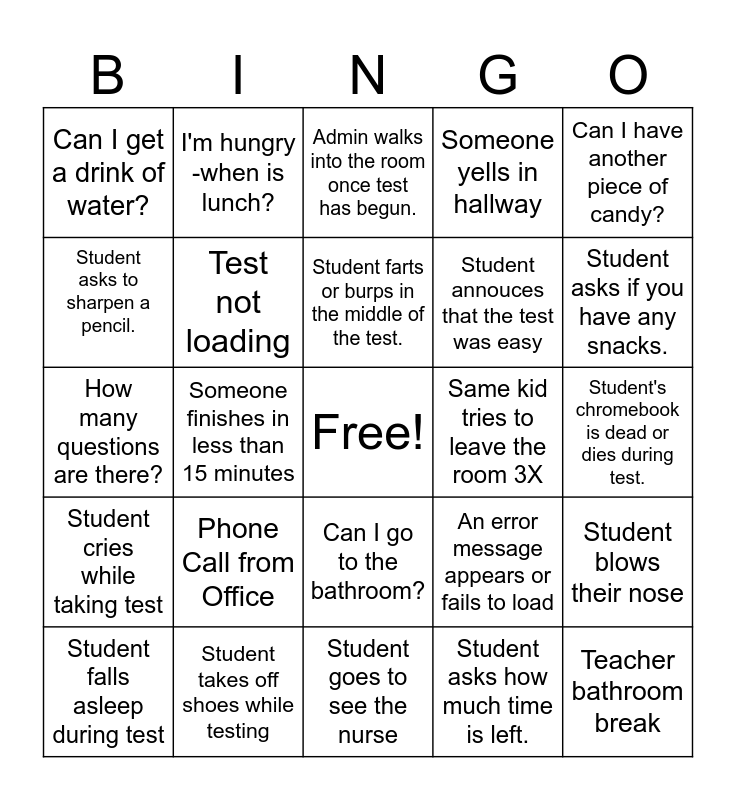 This bingo card has a free space and 26 words: Can I go to the bathroom?, Student asks how much time is left., Student farts or burps in the middle of the test., Student takes off shoes while testing, Can I have another piece of candy?, Can I get a drink of water?, Student asks to sharpen a pencil., I'm hungry -when is lunch?, Student's chromebook is dead or dies during test., An error message appears or fails to load, Student annouces that the test was easy, How many questions are there?, Student blows their nose, Student falls asleep during test, Someone finishes in less than 15 minutes, Student asks why we have to do this, Someone yells in hallway, Student cries while taking test, Admin walks into the room once test has begun., Teacher bathroom break, Student asks if you have any snacks., Student goes to see the nurse, Same kid tries to leave the room 3X, Phone Call from Office, Test not loading and Someone at your classroom door.