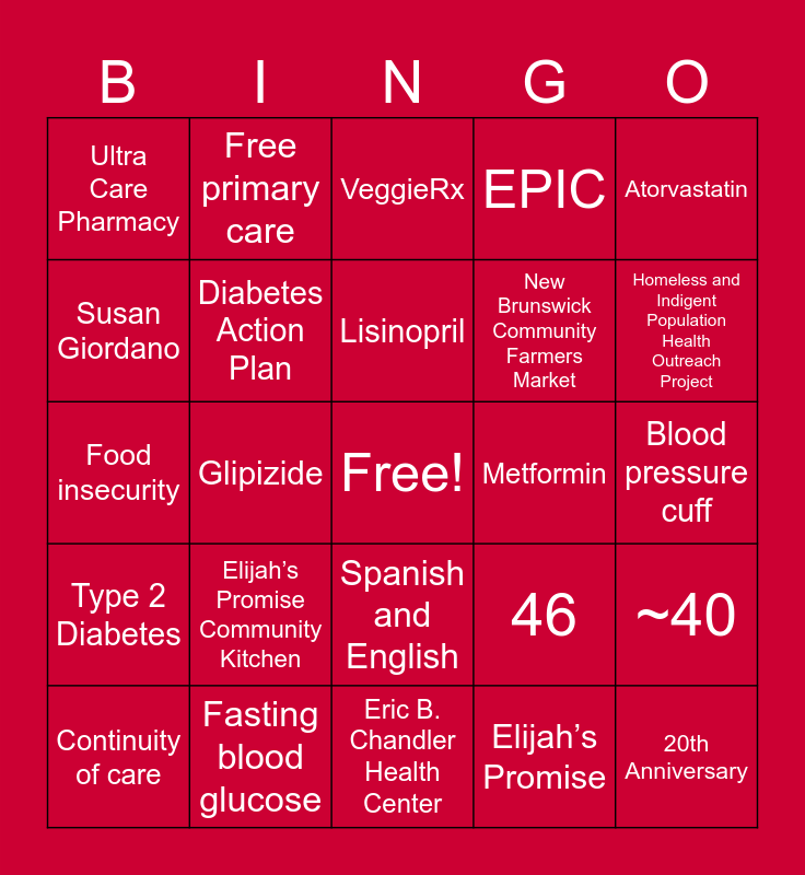 This bingo card has a free space and 46 words: 2005, 20th Anniversary, St. John’s Clinic, Eric B. Chandler Health Center, Elijah’s Promise Community Kitchen, Student-run free clinic, Free primary care, Dr. Karen Wei-Ru Lin, Susan Giordano, VeggieRx, Diabetes Action Plan, EPIC, ~40, 46, 50 years, 400 prescriptions, Lisinopril, Metformin, Amlodipine, Atorvastatin, Glipizide, Elijah’s Promise, Ultra Care Pharmacy, New Brunswick Community Farmers Market, Robert Wood Johnson Medical School, Homeless and Indigent Population Health Outreach Project, Continuity of care, Team-based care, Spanish and English, Type 2 Diabetes, Hypertension, Hyperlipidemia, GERD, Tobacco use, HbA1c, Fasting blood glucose, Blood pressure cuff, Glucometer, Fitbit, Dr. Karen Lin, Nellie Agosta, VeggieRx, Food insecurity, Housing, Employment and Health literacy.