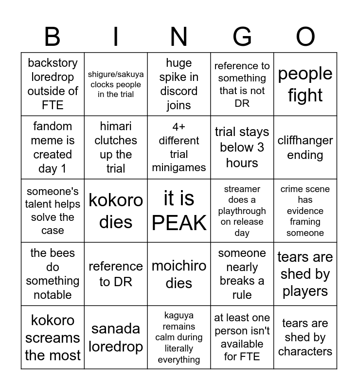 This bingo card has a free space and 24 words: reference to DR, sanada loredrop, 4+ different trial minigames, kokoro screams the most, people fight, backstory loredrop outside of FTE, fandom meme is created day 1, shigure/sakuya clocks people in the trial, streamer does a playthrough on release day, moichiro dies, trial stays below 3 hours, someone's talent helps solve the case, someone nearly breaks a rule, tears are shed by players, himari clutches up the trial, at least one person isn't available for FTE, crime scene has evidence framing someone, huge spike in discord joins, cliffhanger ending, kokoro dies, tears are shed by characters, the bees do something notable, reference to something that is not DR and kaguya remains calm during literally everything.