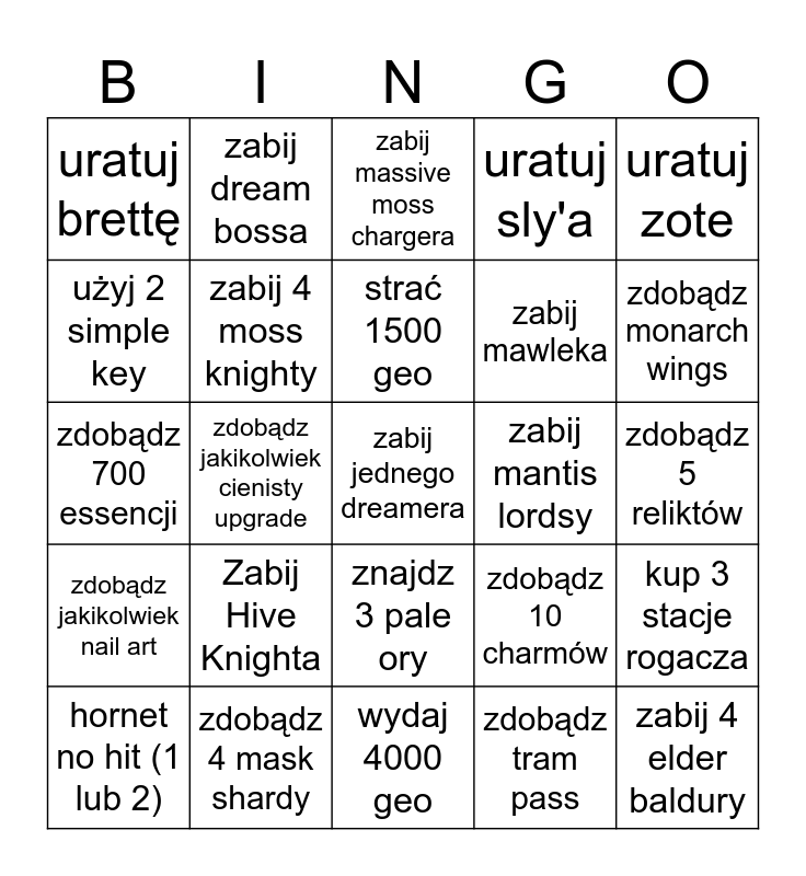 This bingo card has a free space and 24 words: Zabij Hive Knighta, zdobądz 4 mask shardy, strać 1500 geo, hornet no hit (1 lub 2), uratuj zote, uratuj brettę, użyj 2 simple key, zabij dream bossa, zabij mantis lordsy, znajdz 3 pale ory, zabij mawleka, zdobądz 700 essencji, zdobądz 10 charmów, kup 3 stacje rogacza, zabij 4 moss knighty, zdobądz tram pass, zdobądz 5 reliktów, zabij massive moss chargera, zdobądz monarch wings, zdobądz jakikolwiek cienisty upgrade, zabij 4 elder baldury, zdobądz jakikolwiek nail art, uratuj sly'a and wydaj 4000 geo.