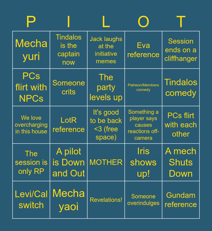 This bingo card has a free space and 38 words: Tom Bloom simping (affectionate), Nat 1, Nat 20, Someone crits, A mech Shuts Down, A pilot is Down and Out, The party levels up, ~technical difficulties~, Session ends on a cliffhanger, Patreon/Members comedy, LotR reference, Eva reference, Gundam reference, PCs flirt with each other, PCs flirt with NPCs, The session is only RP, Combat happens this session, Jack laughs at the initiative memes, Queerbaiting, Something a player says causes reactions off-camera, Mecha yuri, Mecha yaoi, Tindalos comedy, Levi/Cal switch, Someone takes on a burden, Revelations!, Something explodes (that is NOT supposed to explode), RIZZ, A PC dies, Self destruct!, FREAKY LICH MOMENT, MOTHER, Someone overindulges, Tindalos is the captain now, Aster recovers a memory, Iris shows up!, We love overcharging in this house and Valerian is rescued!.