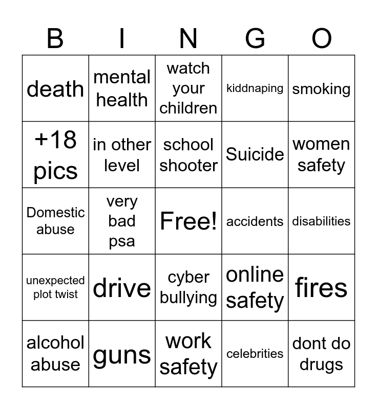 This bingo card has a free space and 24 words: drive, guns, school shooter, alcohol abuse, smoking, death, +18 pics, mental health, accidents, cyber bullying, Suicide, Domestic abuse, online safety, fires, in other level, celebrities, disabilities, watch your children, women safety, very bad psa, dont do drugs, unexpected plot twist, kiddnaping and work safety.