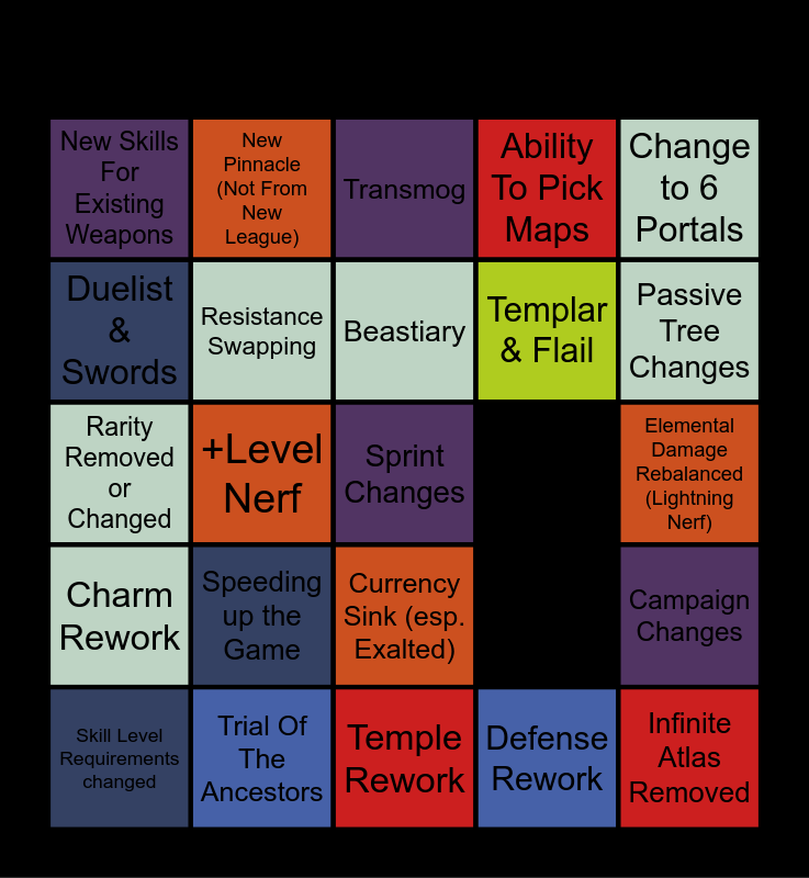 This bingo card has 25 words: Speeding up the Game, Temple Rework, Beastiary, Skill Level Requirements changed, Change to 6 Portals, New Skills For Existing Weapons, Duelist & Swords, New Pinnacle (Not From New League), 3+ New Ascendancies, Currency Sink (esp. Exalted), Templar & Flail, Rarity Removed or Changed, Atlas Tree Rework, Campaign Changes, Resistance Swapping, Infinite Atlas Removed, Elemental Damage Rebalanced (Lightning Nerf), Transmog, Passive Tree Changes, +Level Nerf, Sprint Changes, Trial Of The Ancestors, Charm Rework, Ability To Pick Maps and Defense Rework.
