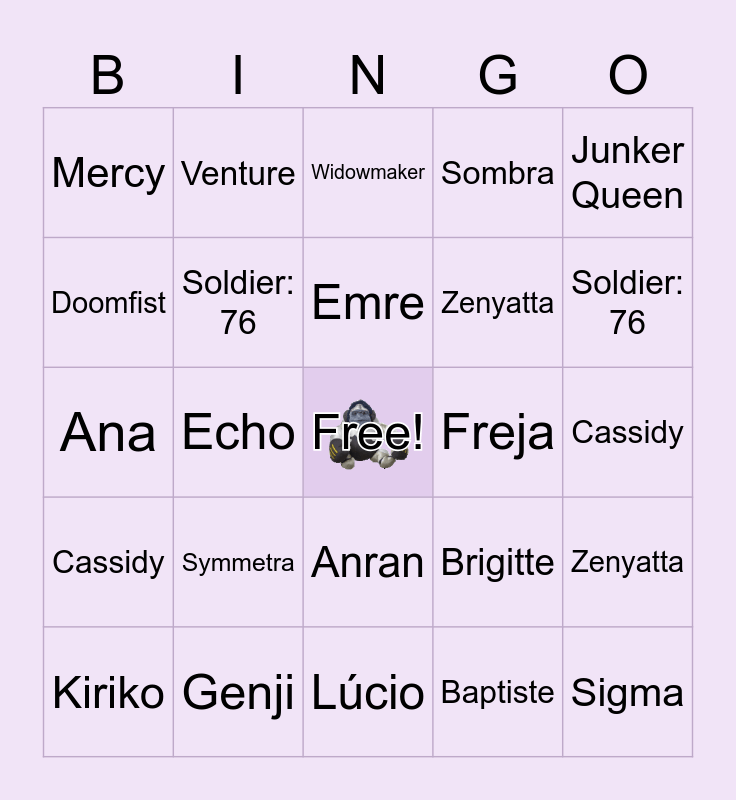 This bingo card has a free space and 102 words: D.Va, Doomfist, Junker Queen, Mauga, Orisa, Ramattra, Reinhardt, Roadhog, Sigma, Winston, Wrecking Ball, Zarya, Hazard, Domina, Ashe, Bastion, Cassidy, Echo, Genji, Hanzo, Junkrat, Mei, Pharah, Reaper, Sojourn, Soldier: 76, Sombra, Symmetra, Torbjörn, Tracer, Venture, Widowmaker, Freja, Vendetta, Emre, Anran, Mizuki, Sierra, Ana, Baptiste, Brigitte, Illari, Kiriko, Lifeweaver, Lúcio, Mercy, Moira, Zenyatta, Juno, Wuyang, Jetpack Cat, D.Va, Doomfist, Junker Queen, Mauga, Orisa, Ramattra, Reinhardt, Roadhog, Sigma, Winston, Wrecking Ball, Zarya, Hazard, Domina, Ashe, Bastion, Cassidy, Echo, Genji, Hanzo, Junkrat, Mei, Pharah, Reaper, Sojourn, Soldier: 76, Sombra, Symmetra, Torbjörn, Tracer, Venture, Widowmaker, Freja, Vendetta, Emre, Anran, Mizuki, Sierra, Ana, Baptiste, Brigitte, Illari, Kiriko, Lifeweaver, Lúcio, Mercy, Moira, Zenyatta, Juno, Wuyang and Jetpack Cat.