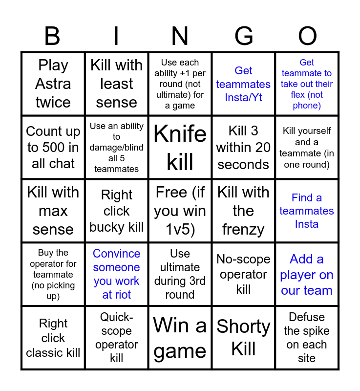This bingo card has a free space and 24 words: Convince someone you work at riot, Quick-scope operator kill, Knife kill, Right click classic kill, Get teammate to take out their flex (not phone), Play Astra twice, Count up to 500 in all chat, Kill with least sense, Kill with the frenzy, Use ultimate during 3rd round, Kill 3 within 20 seconds, Kill with max sense, No-scope operator kill, Add a player on our team, Use an ability to damage/blind all 5 teammates, Shorty Kill, Find a teammates Insta, Use each ability +1 per round (not ultimate) for a game, Kill yourself and a teammate (in one round), Right click bucky kill, Defuse the spike on each site, Buy the operator for teammate (no picking up), Get teammates Insta/Yt and Win a game.