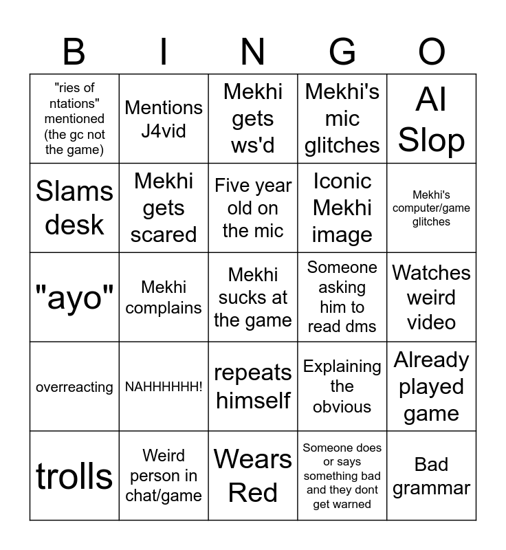 This bingo card has 49 words: Long Intro (5+) Minutes, Mekhi sucks at the game, Makes the same joke over three times, Wears Red, NAHHHHHH!, Disintegrates into webcam, Mentions J4vid, Unrelated Tangent, Slams desk, Mentions groog, Mekhi gets scared, Mekhi's mic glitches, Already played game, Explaining the obvious, Something racist is directed towards Mekhi, Zahmir/Cappy mentioned, Five year old on the mic, Someone asking him to read dms, Drama, AI Slop, Mekhi complains, Someone does or says something bad and they dont get warned, "ries of ntations" mentioned (the gc not the game), Iconic Mekhi image, Says a word wrong, Mekhi's computer/game glitches, trolls, Mekhi not understanding something, repeats himself, overreacting, Someone lies to Mekhi and he believes it, Hides screen, Someone sends an image with Mekhi's face, BROOOOO, Weird person in chat/game, Mekhi leaks dms, Barney gets bullied, Sub goal reached, Watches weird video, Reacts to videos for over 5 minutes straight, Obvious Alt Account, Mekhi uses gc instead of stage, Bad grammar, Agonizingly Boring, "ayo", Mekhi gets ws'd, Playing slop, Leaves game early and Mekhi eats/drinks.