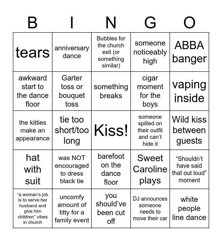 This bingo card has a free space and 24 words: was NOT encouraged to dress black tie, uncomfy amount of titty for a family event, something breaks, “a woman’s job is to serve her husband and give him children” vibes in church, ABBA banger, tears, awkward start to the dance floor, anniversary dance, someone spilled on their outfit and can’t hide it, barefoot on the dance floor, cigar moment for the boys, the kitties make an appearance, Sweet Caroline plays, “Shouldn’t have said that out loud” moment, Garter toss or bouquet toss, DJ announces someone needs to move their car, Wild kiss between guests, Bubbles for the church exit (or something similar), vaping inside, tie too short/too long, white people line dance, hat with suit, someone noticeably high and you should’ve been cut off.