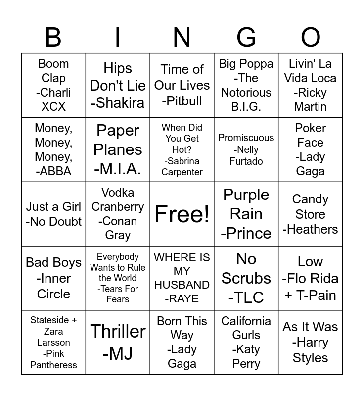 This bingo card has a free space and 29 words: Stateside + Zara Larsson -Pink Pantheress, Good Luck, Babe! -Chappell Roan, Vodka Cranberry -Conan Gray, Maniac -Conan Gray, Boom Clap -Charli XCX, Time of Our Lives -Pitbull, Paper Planes -M.I.A., Everybody Wants to Rule the World -Tears For Fears, Purple Rain -Prince, Thriller -MJ, Candy Store -Heathers, As It Was -Harry Styles, Born This Way -Lady Gaga, California Gurls -Katy Perry, Poker Face -Lady Gaga, Starships -Nicki Minaj, WHERE IS MY HUSBAND -RAYE, Bad Boys -Inner Circle, Livin' La Vida Loca -Ricky Martin, Just a Girl -No Doubt, No Scrubs -TLC, 9 to 5 -Dolly Parton, Promiscuous -Nelly Furtado, Money, Money, Money, -ABBA, Big Poppa -The Notorious B.I.G., Hips Don't Lie -Shakira, Low -Flo Rida + T-Pain, When Did You Get Hot? -Sabrina Carpenter and ...Baby One More Time -Britney Spears.