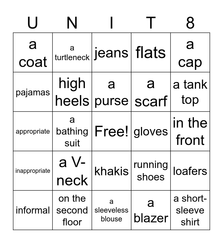 This bingo card has a free space and 50 words: a long-sleeve shirt, a short-sleeve shirt, a polo shirt, a sleeveless blouse, a V-neck, a crewneck, a turtleneck, a cardigan, pajamas, a nightgown, high heels, flats, loafers, running shoes, sandals, a belt, a purse, gloves, a hat, a cap, a bathing suit, a blazer, a coat, a scarf, a shirt, a sweatshirt, a tank top, a T-shirt, jeans, khakis, shorts, slacks, on the top floor, on the third floor, on the second floor, on the first floor, on the ground floor, in the basement, in the back, in the front, take the escalator, take the stairs, take the elevator, formal, informal, appropriate, liberal, conservative, inappropriate and sweatpants.