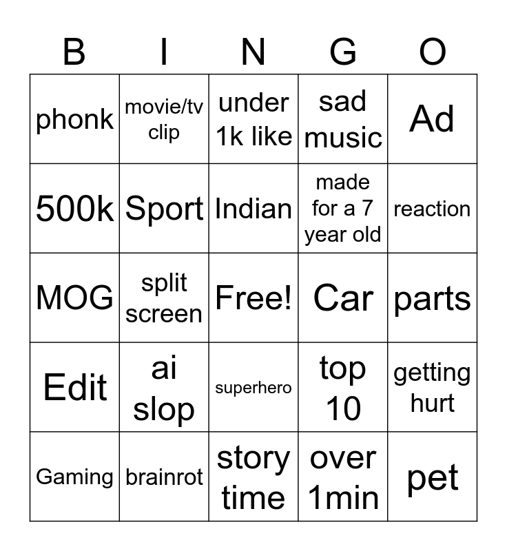This bingo card has a free space and 24 words: ai slop, brainrot, Indian, Gaming, Ad, phonk, 500k, movie/tv clip, Car, superhero, made for a 7 year old, MOG, top 10, getting hurt, Sport, over 1min, parts, under 1k like, reaction, split screen, pet, Edit, sad music and story time.