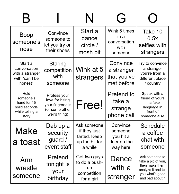This bingo card has a free space and 24 words: Dab up a security guard / event staff, Pretend tonight is your birthday, Wink at 5 strangers, Arm wrestle someone, Take 10 0.5x selfies with strangers, Boop someone’s nose, Start a conversation with a stranger with “can I be honest”, Convince someone to let you try on their shoes, Pretend to take a strange phone call, Ask someone if they just farted. Keep up the bit for a while, Convince a stranger that you’ve met before, Hold someone’s hand for 15 solid seconds while telling a story, Convince someone you hit a deer on the way here, Schedule a coffee chat with someone, Staring competition with someone, Dance with a stranger, Speak with a friend of yours in a fake language in front of someone else, Start a dance circle / mosh pit, Try to convince a stranger you’re from a different place / country, Profess your love for biting your fingernails (or some other weird thing), Ask someone to take a pic of you, then make them analyze it and tell you what’s good and bad about it, Make a toast, Wink 5 times in a conversation with someone and Get two guys to do a push-up competition for a girl.