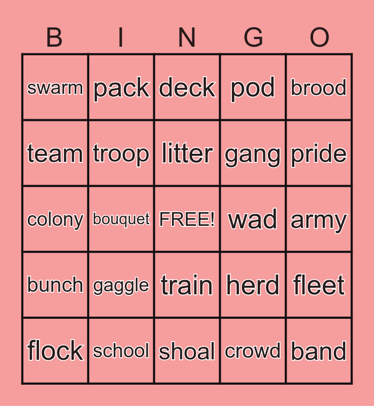 This bingo card has a free space and 24 words: flock, gaggle, litter, crowd, brood, swarm, pack, deck, wad, army, colony, troop, herd, fleet, team, school, shoal, pod, pride, bunch, bouquet, train, gang and band.