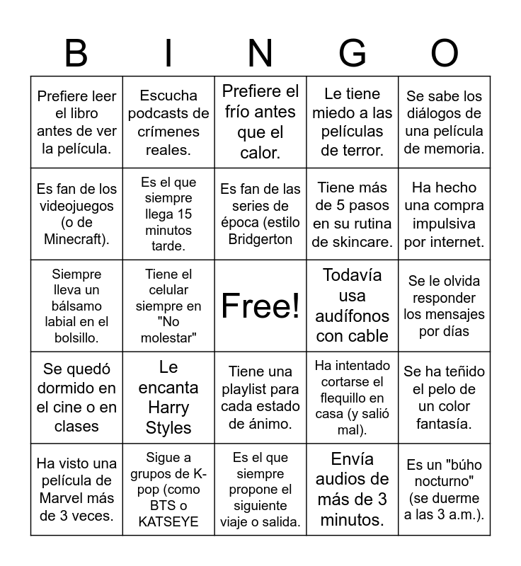 This bingo card has a free space and 24 words: Le encanta Harry Styles, Sigue a grupos de K-pop (como BTS o KATSEYE, Es fan de las series de época (estilo Bridgerton, Ha visto una película de Marvel más de 3 veces., Se sabe los diálogos de una película de memoria., Prefiere leer el libro antes de ver la película., Es fan de los videojuegos (o de Minecraft)., Escucha podcasts de crímenes reales., Todavía usa audífonos con cable, Tiene una playlist para cada estado de ánimo., Tiene más de 5 pasos en su rutina de skincare., Siempre lleva un bálsamo labial en el bolsillo., Ha intentado cortarse el flequillo en casa (y salió mal)., Se ha teñido el pelo de un color fantasía., Es el que siempre llega 15 minutos tarde., Envía audios de más de 3 minutos., Se le olvida responder los mensajes por días, Prefiere el frío antes que el calor., Ha hecho una compra impulsiva por internet., Tiene el celular siempre en "No molestar", Es un "búho nocturno" (se duerme a las 3 a.m.)., Se quedó dormido en el cine o en clases, Le tiene miedo a las películas de terror. and Es el que siempre propone el siguiente viaje o salida..