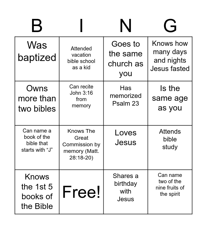 This bingo card has 25 words: Is a member of Mount Pleasant, Has the same favorite bible verse as you, Is the same age as you, Has served in their church, Owns more than two bibles, Was baptized, Can recite John 3:16 from memory, Attended vacation bible school as a kid, Free!, Has been on a missions trip, Can name a book of the bible that starts with “J”, Loves Jesus, Has a bible with them, Has read the whole bible, Has memorized Psalm 23, Has a first name that’s in the Bible, Shares a birthday with Jesus, Goes to the same church as you, Knows The Great Commission by memory (Matt. 28:18-20), Attends bible study, Knows the 1st 5 books of the Bible, Knows one of the seven things Jesus said on the cross, Can name two of the nine fruits of the spirit, Knows how many days and nights Jesus fasted and Can name the four gospels in the New Testament.