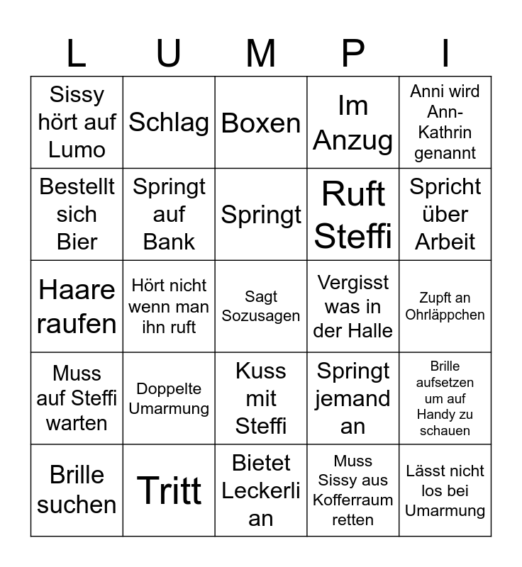 This bingo card has a free space and 24 words: Doppelte Umarmung, Tritt, Springt, Brille suchen, Anni wird Ann-Kathrin genannt, Sissy hört auf Lumo, Bestellt sich Bier, Schlag, Vergisst was in der Halle, Kuss mit Steffi, Ruft Steffi, Haare raufen, Springt jemand an, Brille aufsetzen um auf Handy zu schauen, Springt auf Bank, Muss Sissy aus Kofferraum retten, Zupft an Ohrläppchen, Boxen, Spricht über Arbeit, Hört nicht wenn man ihn ruft, Lässt nicht los bei Umarmung, Muss auf Steffi warten, Im Anzug and Bietet Leckerli an.