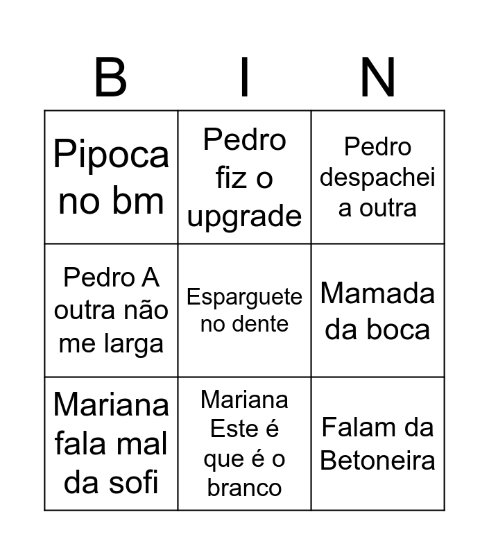 This bingo card has 10 words: Mariana fala mal da sofi, Pedro fiz o upgrade, Pedro despachei a outra, Pedro A outra não me larga, Esparguete no dente, Falam da Betoneira, Pipoca no bm, Mariana Este é que é o branco, Mamada da boca and Motel.