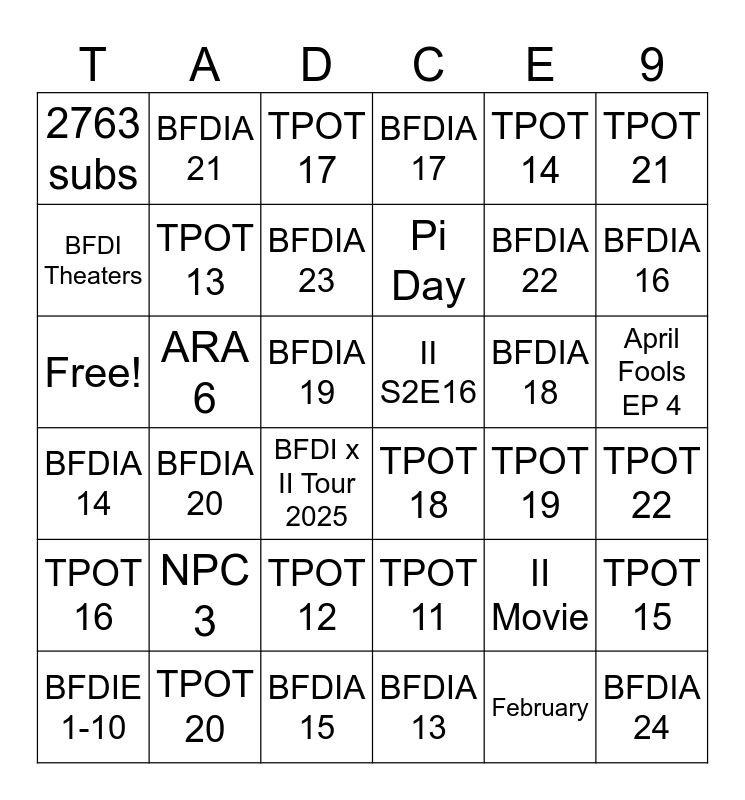 This bingo card has 36 words: TPOT 11, TPOT 12, BFDIA 13, BFDI Theaters, BFDIA 14, II S2E16, TPOT 13, BFDIA 15, TPOT 14, II Movie, BFDIA 16, BFDIA 17, TPOT 15, ARA 6, Pi Day, 2763 subs, TPOT 16, BFDIA 18, Free!, TPOT 17, BFDIA 19, BFDIA 20, TPOT 18, BFDI x II Tour 2025, TPOT 19, BFDIA 21, BFDIA 22, TPOT 20, BFDIA 23, TPOT 21, BFDIA 24, BFDIE 1-10, TPOT 22, April Fools EP 4, NPC 3 and February.