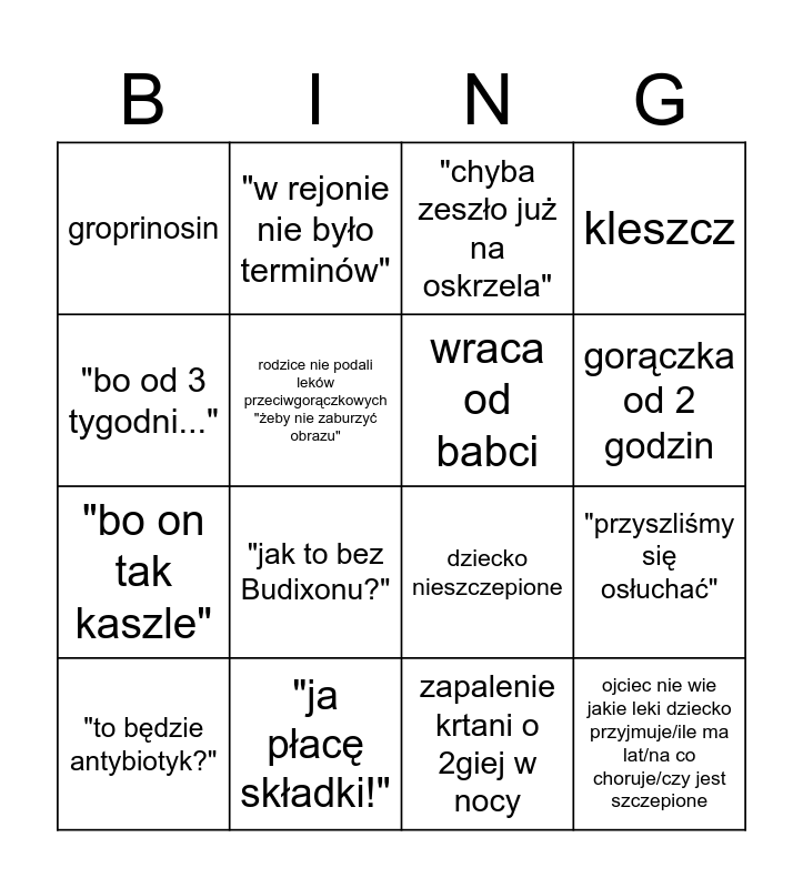 This bingo card has 16 words: "ja płacę składki!", "przyszliśmy się osłuchać", "chyba zeszło już na oskrzela", groprinosin, "bo on tak kaszle", "w rejonie nie było terminów", dziecko nieszczepione, zapalenie krtani o 2giej w nocy, "bo od 3 tygodni...", rodzice nie podali leków przeciwgorączkowych "żeby nie zaburzyć obrazu", "to będzie antybiotyk?", kleszcz, "jak to bez Budixonu?", gorączka od 2 godzin, wraca od babci and ojciec nie wie jakie leki dziecko przyjmuje/ile ma lat/na co choruje/czy jest szczepione.