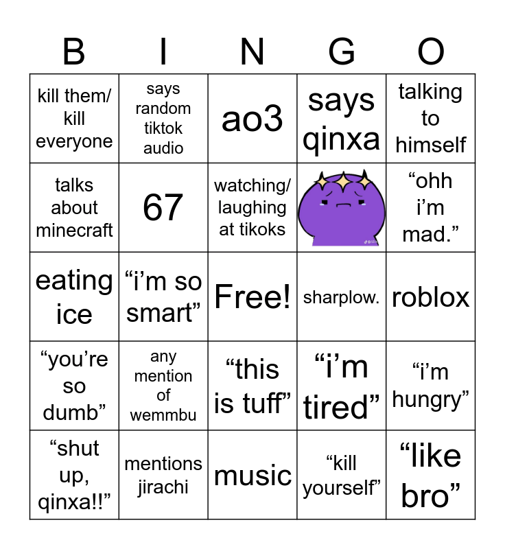 This bingo card has 1 images, a free space and 23 words: “shut up, qinxa!!”, any mention of wemmbu, watching/ laughing at tikoks, “kill yourself”, talking to himself, kill them/ kill everyone, says random tiktok audio, ao3, sharplow., roblox, eating ice, 67, “i’m tired”, “i’m hungry”, talks about minecraft, mentions jirachi, music, says qinxa, “ohh i’m mad.”, “you’re so dumb”, “i’m so smart”, “this is tuff” and “like bro”.
