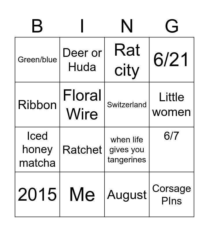 This bingo card has 20 words: 2015, Abdullah, Rat city, 6/7, 2, Ratchet, August, 6/21, Iced honey matcha, Deer or Huda, when life gives you tangerines, Little women, Green/blue, Me, Switzerland, Hydrangeas, Ribbon, Floral Wire, Corsage Wristlets and Corsage PIns.
