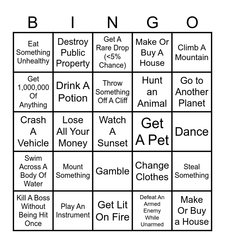 This bingo card has 25 words: Mount Something, Get Lit On Fire, Throw Something Off A Cliff, Kill A Boss Without Being Hit Once, Climb A Mountain, Eat Something Unhealthy, Get 1,000,000 Of Anything, Destroy Public Property, Get A Pet, Gamble, Hunt an Animal, Crash A Vehicle, Change Clothes, Steal Something, Drink A Potion, Make Or Buy a House, Dance, Get A Rare Drop (<5% Chance), Go to Another Planet, Lose All Your Money, Watch A Sunset, Play An Instrument, Swim Across A Body Of Water, Make Or Buy A House and Defeat An Armed Enemy While Unarmed.