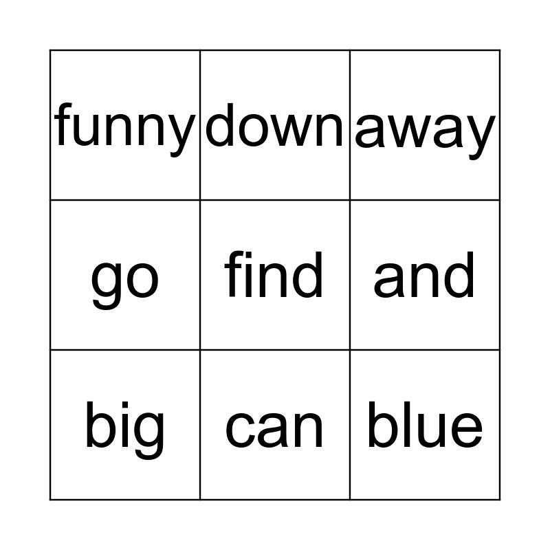 This bingo card has a free space and 8 words: and, away, down, big, funny, blue, go and can.