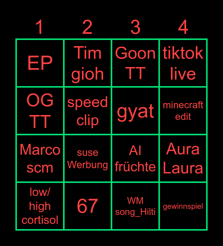This bingo card has 16 words: 67, Aura Laura, Goon TT, EP, Marco scm, Tim gioh, AI früchte, WM song_Hilti, OG TT, speed clip, low/ high cortisol, tiktok live, suse Werbung, minecraft edit, gyat and gewinnspiel.