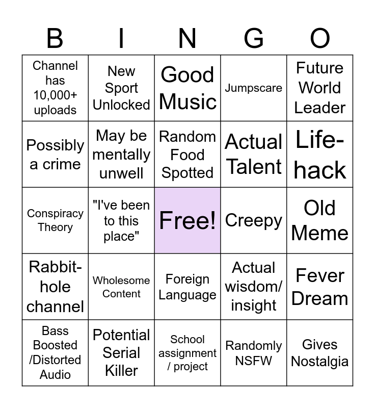 This bingo card has a free space and 24 words: Bass Boosted /Distorted Audio, Wholesome Content, Random Food Spotted, Randomly NSFW, Future World Leader, Channel has 10,000+ uploads, New Sport Unlocked, Good Music, Creepy, Old Meme, Conspiracy Theory, May be mentally unwell, Actual wisdom/ insight, Fever Dream, Possibly a crime, Potential Serial Killer, School assignment / project, Jumpscare, Life-hack, Rabbit-hole channel, "I've been to this place", Foreign Language, Actual Talent and Gives Nostalgia.