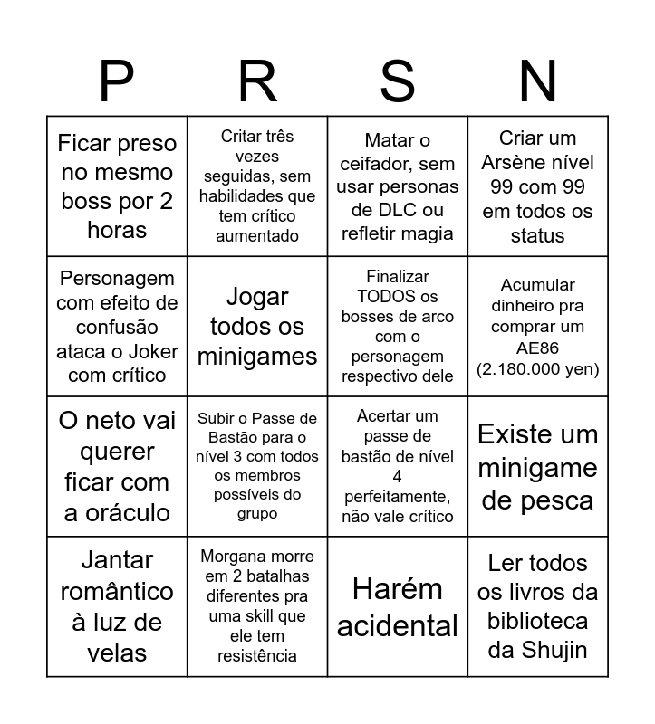 This bingo card has 16 words: Morgana morre em 2 batalhas diferentes pra uma skill que ele tem resistência, Existe um minigame de pesca, Matar o ceifador, sem usar personas de DLC ou refletir magia, Ficar preso no mesmo boss por 2 horas, O neto vai querer ficar com a oráculo, Critar três vezes seguidas, sem habilidades que tem crítico aumentado, Acertar um passe de bastão de nível 4 perfeitamente, não vale crítico, Harém acidental, Personagem com efeito de confusão ataca o Joker com crítico, Jogar todos os minigames, Jantar romântico à luz de velas, Criar um Arsène nível 99 com 99 em todos os status, Subir o Passe de Bastão para o nível 3 com todos os membros possíveis do grupo, Acumular dinheiro pra comprar um AE86 (2.180.000 yen), Finalizar TODOS os bosses de arco com o personagem respectivo dele and Ler todos os livros da biblioteca da Shujin.