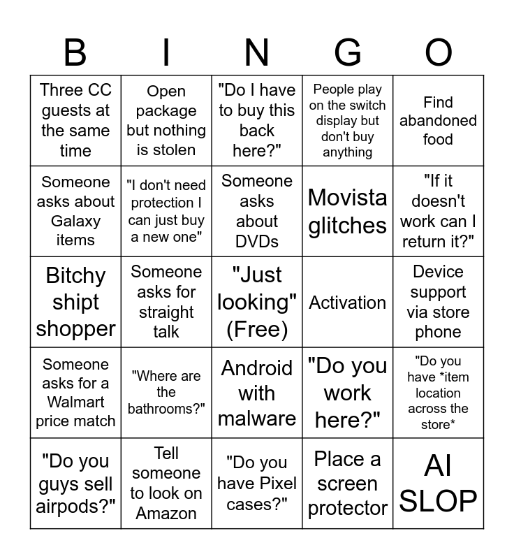 This bingo card has a free space and 35 words: Broken Iris Easy Flip, Big rush before lunch, Red shirt asks for your keys, "I don't need protection I can just buy a new one", Android with malware, People play on the switch display but don't buy anything, Someone asks about Galaxy items, Screaming child, Someone asks about DVDs, Someone says "dumb phone" joke, Bitchy shipt shopper, Find abandoned food, Guest asks something extremely specific, Guest asks for old gen phone case, Three CC guests at the same time, Activation, Place a screen protector, Someone asks for straight talk, Someone asks for a Walmart price match, AI SLOP, "Do you work here?", "Do you guys sell airpods?", "Do you have *item location across the store*, Tell someone to look on Amazon, "Do I have to buy this back here?", "If it doesn't work can I return it?", Guest ignores your help, Zebra glitches, Movista glitches, Device support via store phone, "Can you check the back?", "Do you have Pixel cases?", "Where are the bathrooms?", Open package but nothing is stolen and You have to unlock something in a different department.