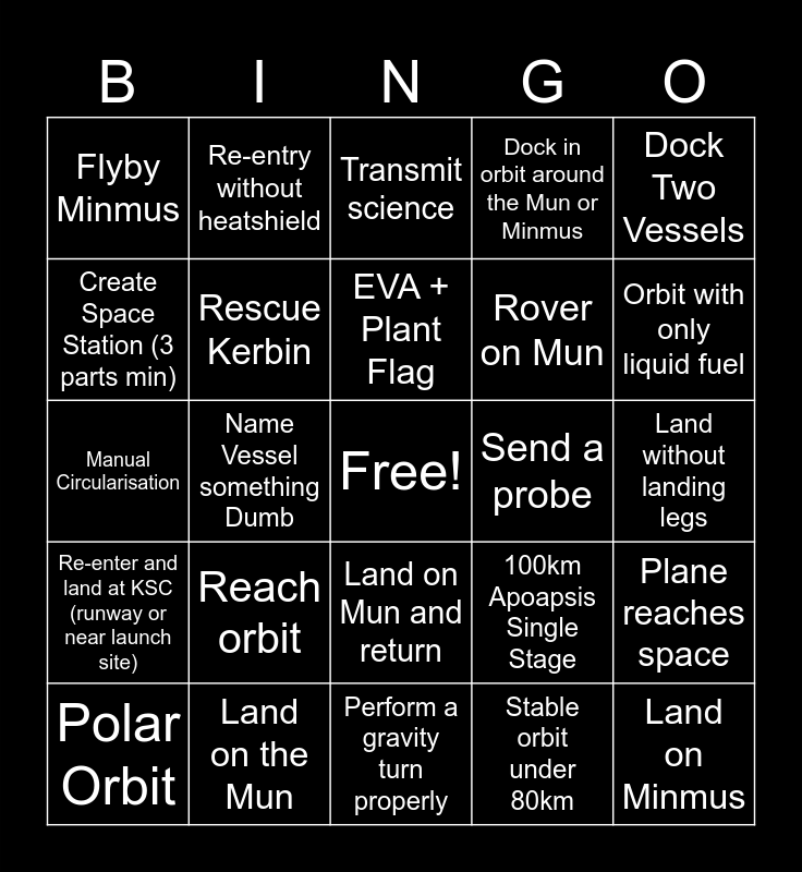This bingo card has a free space and 24 words: Reach orbit, Land on the Mun, EVA + Plant Flag, Polar Orbit, Dock Two Vessels, Flyby Minmus, Create Space Station (3 parts min), Re-entry without heatshield, Send a probe, Land on Mun and return, Rover on Mun, Manual Circularisation, 100km Apoapsis Single Stage, Plane reaches space, Rescue Kerbin, Stable orbit under 80km, Land without landing legs, Transmit science, Orbit with only liquid fuel, Name Vessel something Dumb, Land on Minmus, Re-enter and land at KSC (runway or near launch site), Dock in orbit around the Mun or Minmus and Perform a gravity turn properly.
