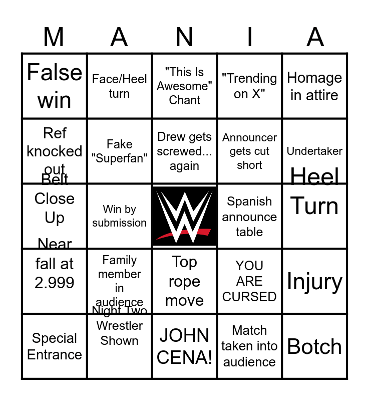 This bingo card has a free space and 52 words: Title changes hands, Botch, Blood, JOHN CENA!, Family member in audience, Brass knuckles, Face/Heel turn, Backlash promo, Ref knocked out, Vetran, Fake "Superfan", New theme song, Injury, YOU ARE CURSED, Entrance interfered, Wardrobe malfunction, Drew gets screwed... again, Spanish announce table, R Truth does something stupid, Homage in attire, Win by submission, Match taken into audience, False win, Announcer gets cut short, Celeb NOT in match, Surprise return, Green shirt guy, Slim Jim ad, Undertaker, HHH, Real phone-man reveal, "Trending on X", Fan Cries, Suicide Dive, Crowd Boos, "This Is Awesome" Chant, Night Two Wrestler Shown, Both wrestlers down, PYRO, Distraction, Face Turn, Heel Turn, Near fall at 2.999, BLIMP!, Top rope move, ROPE BREAK, Interference in match, Belt Close Up, Vehicle Entrance, Danhausen just does his thing, Special Entrance and LIVE BAND.
